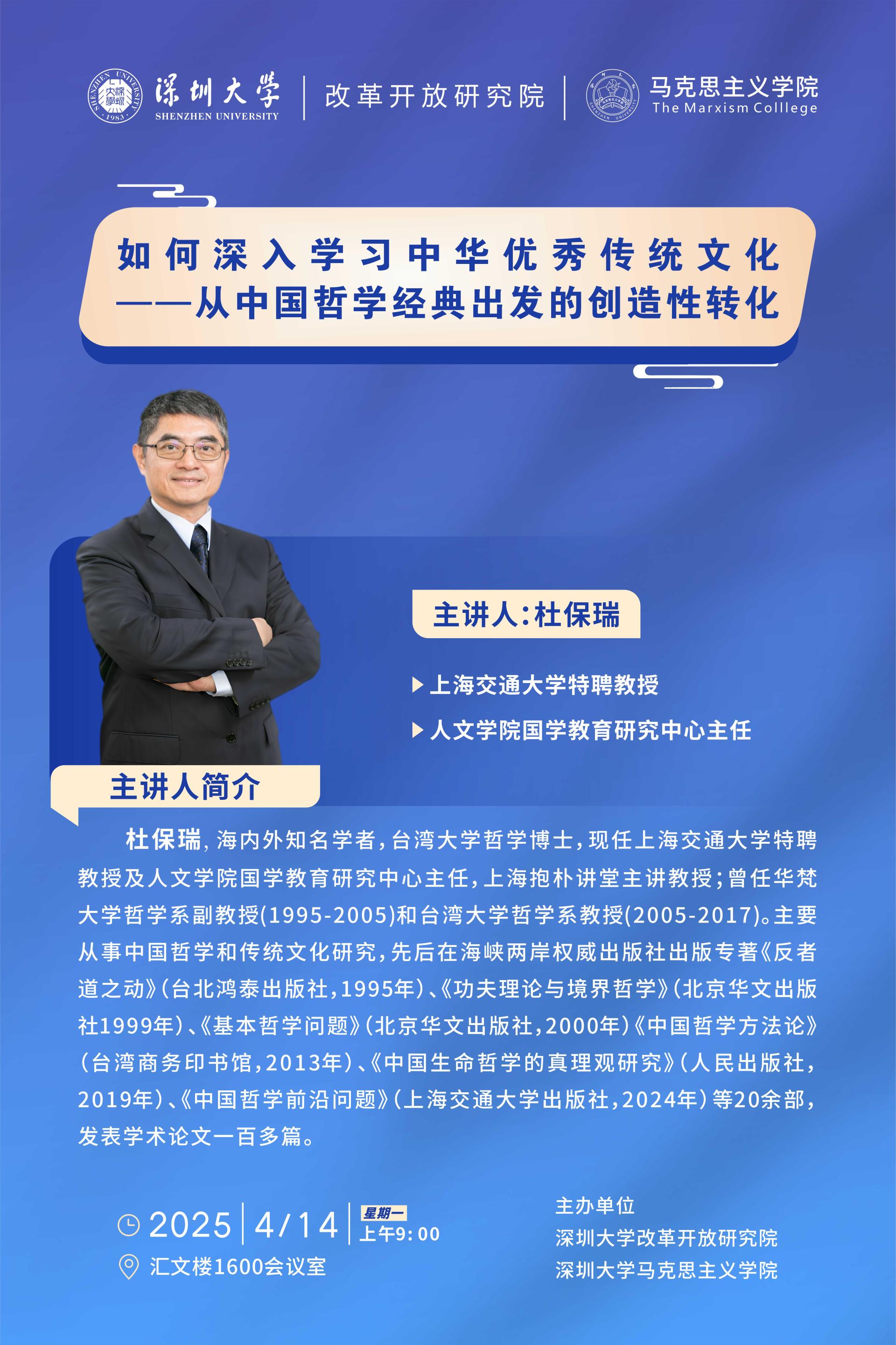 杜保瑞,海内外知名学者,台湾大学哲学博士,现任上海交通大学特聘教授及人文学院国学教育研究中心主任,上海抱朴讲堂主讲教授;曾任华梵大学哲学系副教授(1995-2005)和台湾大学哲学系教授(2005-2017)。主要从事中国哲学和传统文化研究,先后在海峡两岸权威出版社出版专著《反者道之动》(台北鸿泰出版社,1995年)、《功夫理论与境界哲学》(北京华文出版社1999年)、《基本哲学问题》(北京华文出版社,2000年)《中国哲学方法论》(台湾商务印书馆,2013年)、《中国生命哲学的真理观研究》(人民出版社,2019年)、《中国哲学前沿问题》(上海交通大学出版社,2024年)等20余部,发表学术论文一百多篇。